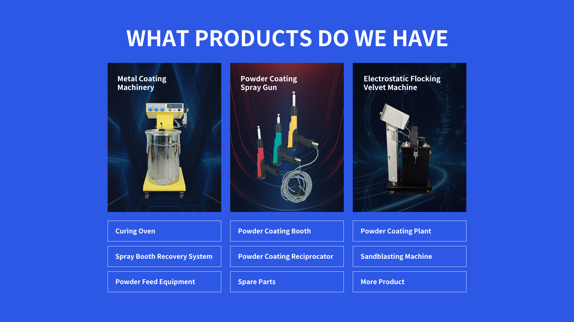 These Powder Coating Machines are used in automotive (car parts, wheels), furniture (metal frames), appliances (refrigerators, ovens), and industrial equipment.
